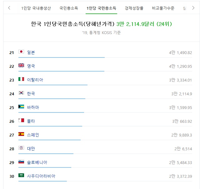 또한 통계청이 발표한 1인당 국민소득 기준 한국은 3만불이 넘는다